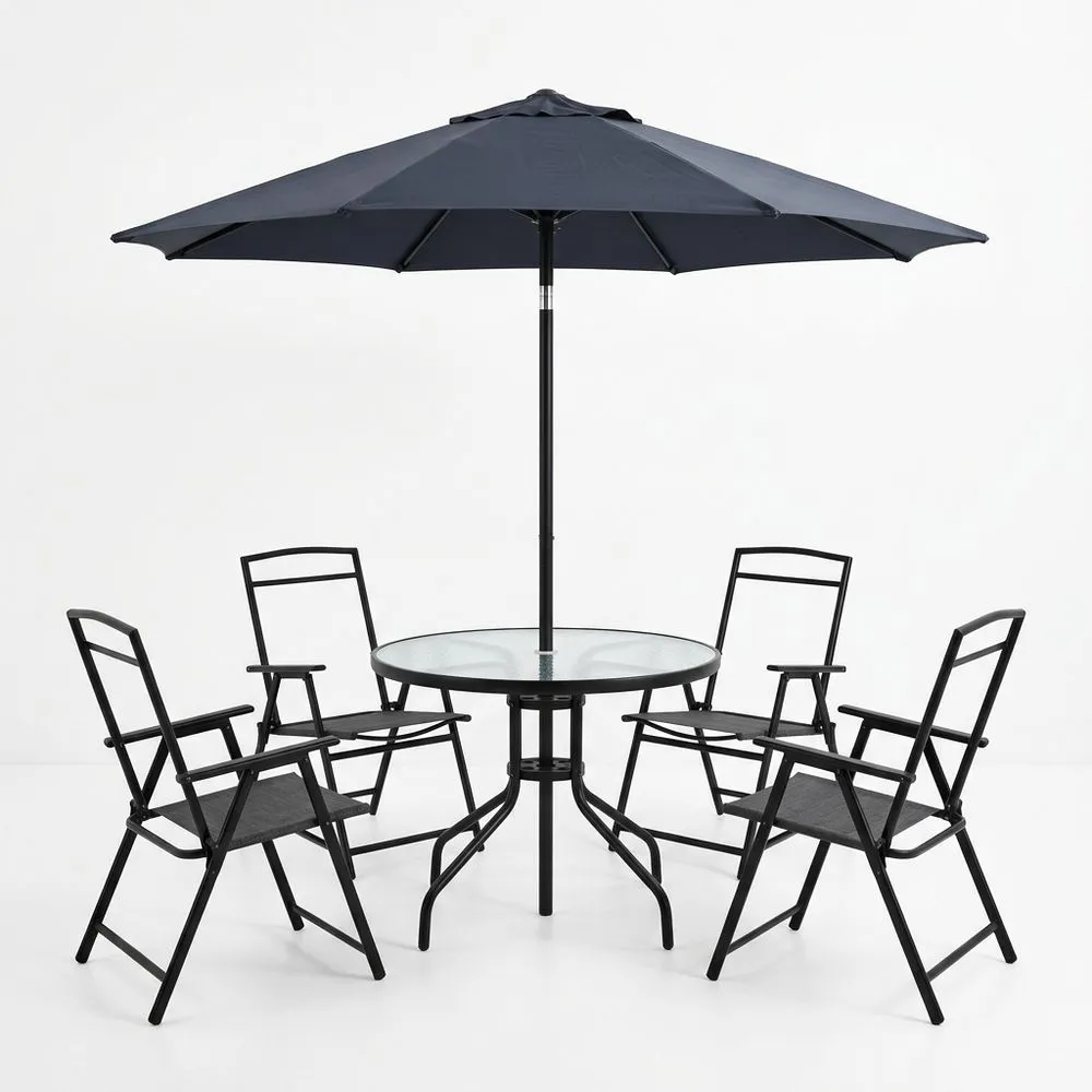 Set da Giardino Nero con Tavolo Rotondo in Vetro Temperato e Ombrellone